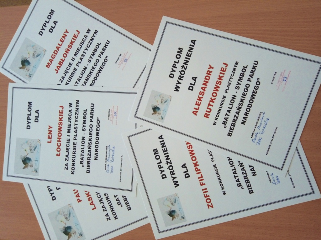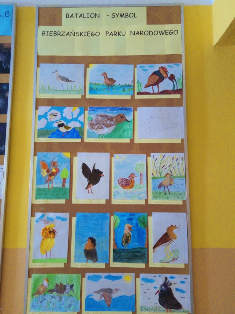 Uczniowie klas 4-7 uczestniczyli w konkursie plastycznym „Batalion – symbol Biebrzańskiego Parku Narodowego”. Celem konkursu było pogłębienie wiedzy o tym niezwykłym ptaku. Uczniowie przed przystąpieniem do konkursu zdobyli wiedzę o batalionie i obejrzeli filmy z tokami batalionów w naszym parku narodowym. Konkurs wygrały: Lena Łochowska, Magdalena Jabłońska i Paulina Laskowska. Komisja konkursowa w składzie pani Teresa Piotrowska i pani Dorota Mroczkowska, wyróżniła również prace Aleksandry Rutkowskiej i Zofii Filipkowskiej. Prace uczniów można obejrzeć na górnym korytarzu.