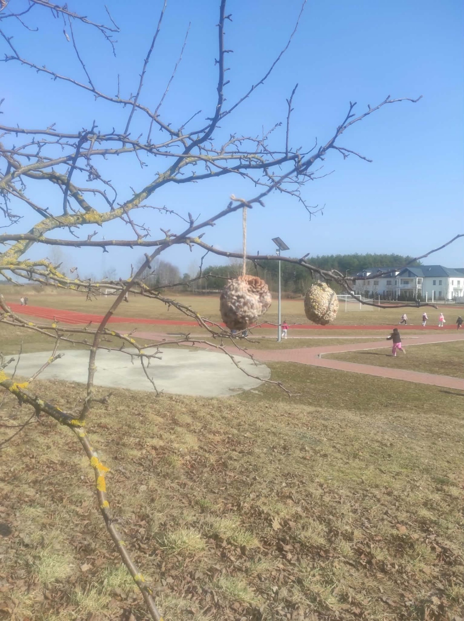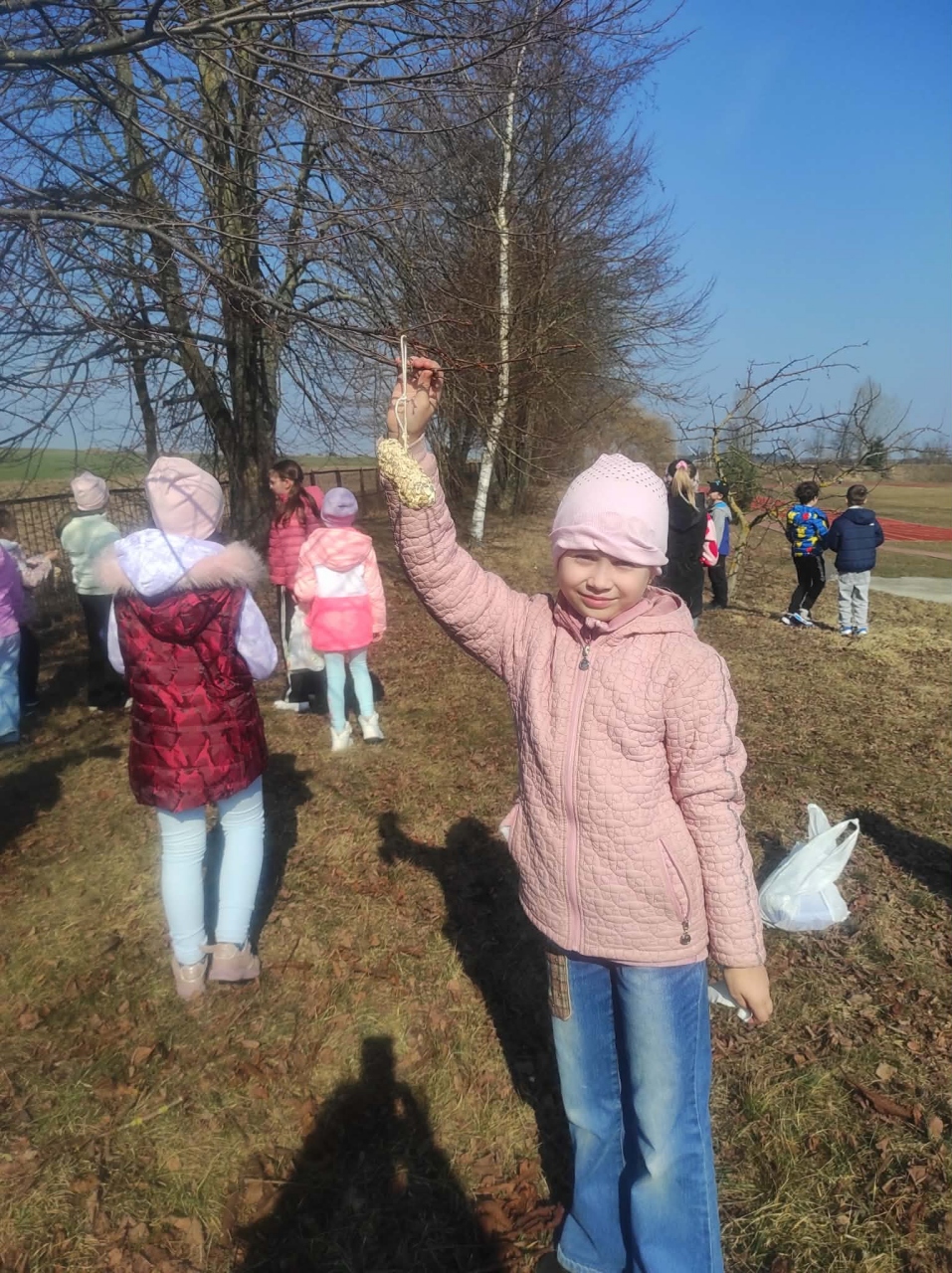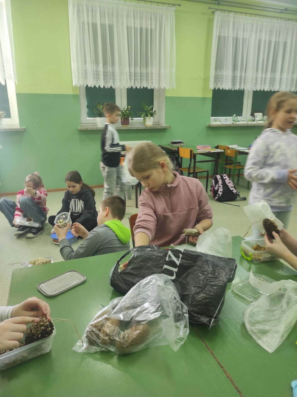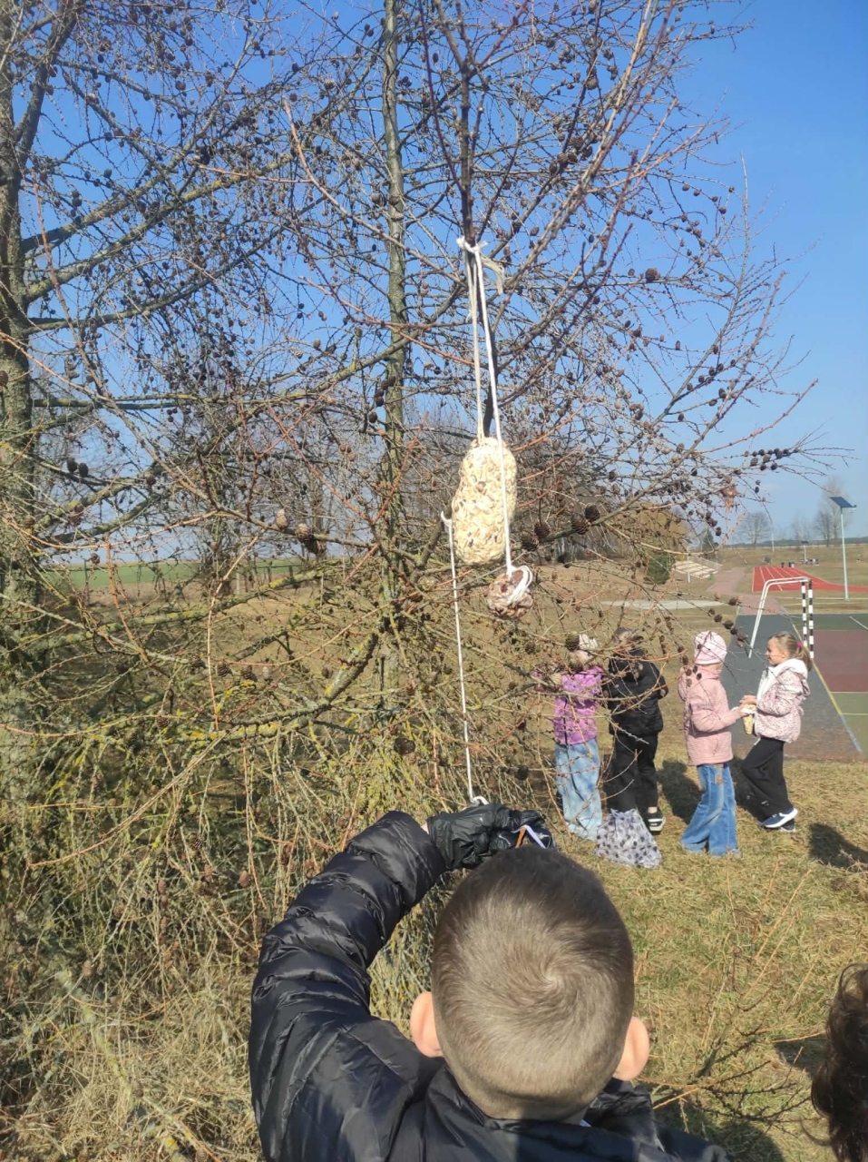 Uczniowie klasy II a wzięli udział w projekcie biblioteki szkolnej pod hasłem: „ Biblioteki pełne dobrej energii”. Do działania na rzecz ptaków zainspirowała ich książka pt. „Chodź na dwór! Praktyczne ćwiczenia z przyrody”. Uczniowie zapoznali się ze sposobami dokarmiania ptaków. Poznali różne składniki pokarmowe, które zostały wykorzystane do wykonania szyszkowych karmników. Na podstawie praktycznych ćwiczeń, które były przedstawione w książce pt. “Chodź na dwór” wykonali szyszki pełne specjałów i smakowitych kąsków dla ptaków. Po czym wybrali się na wycieczkę wokół szkoły celem znalezienia drzew i krzewów. Swoje karmniki pozawieszali na gałęziach. Bacznie obserwując ptaki, które latały wokół. Realizacja tego zadania miała na celu wzmacnianie więzi z naturą, rozwijanie empatii i nawyku pomagania, dzielenia się. Edukacja techniczna połączoną z edukacją przyrodniczą znacznie wpłynęła na kreatywność i rozwój manualnych umiejętności. Dzięki tej wycieczce uczniowie zrozumieli potrzeby ptaków.