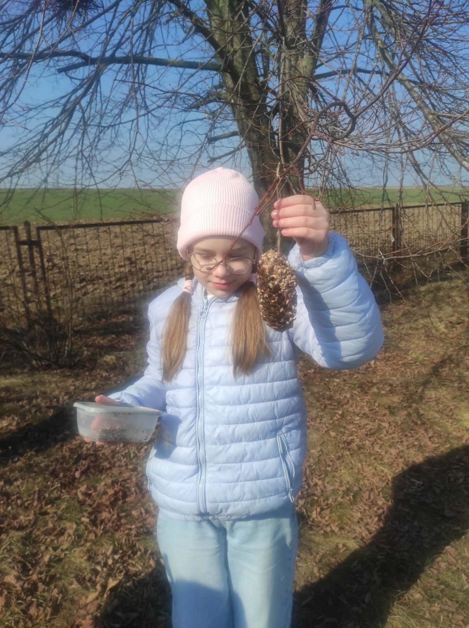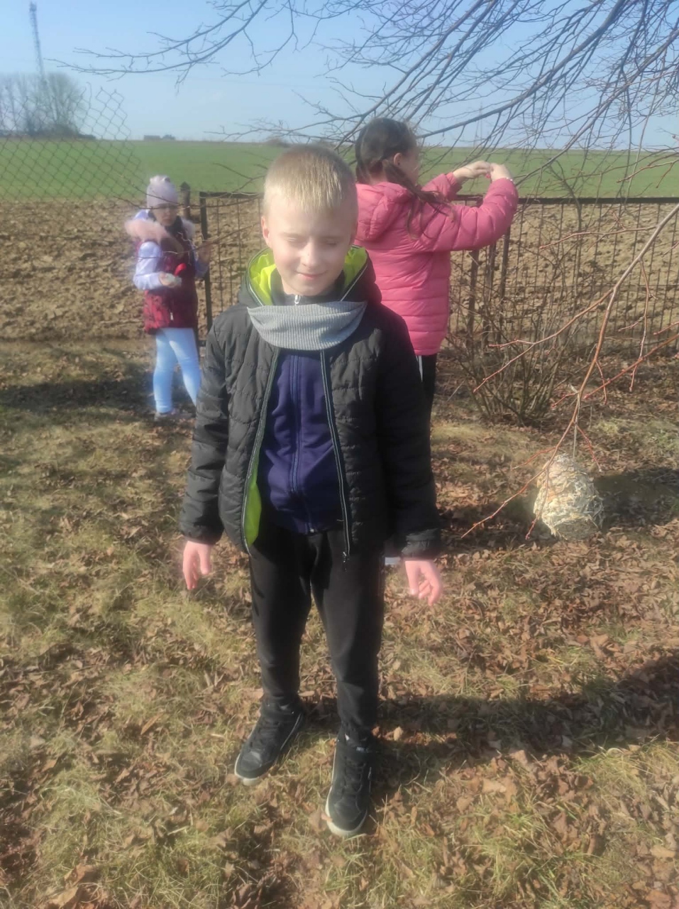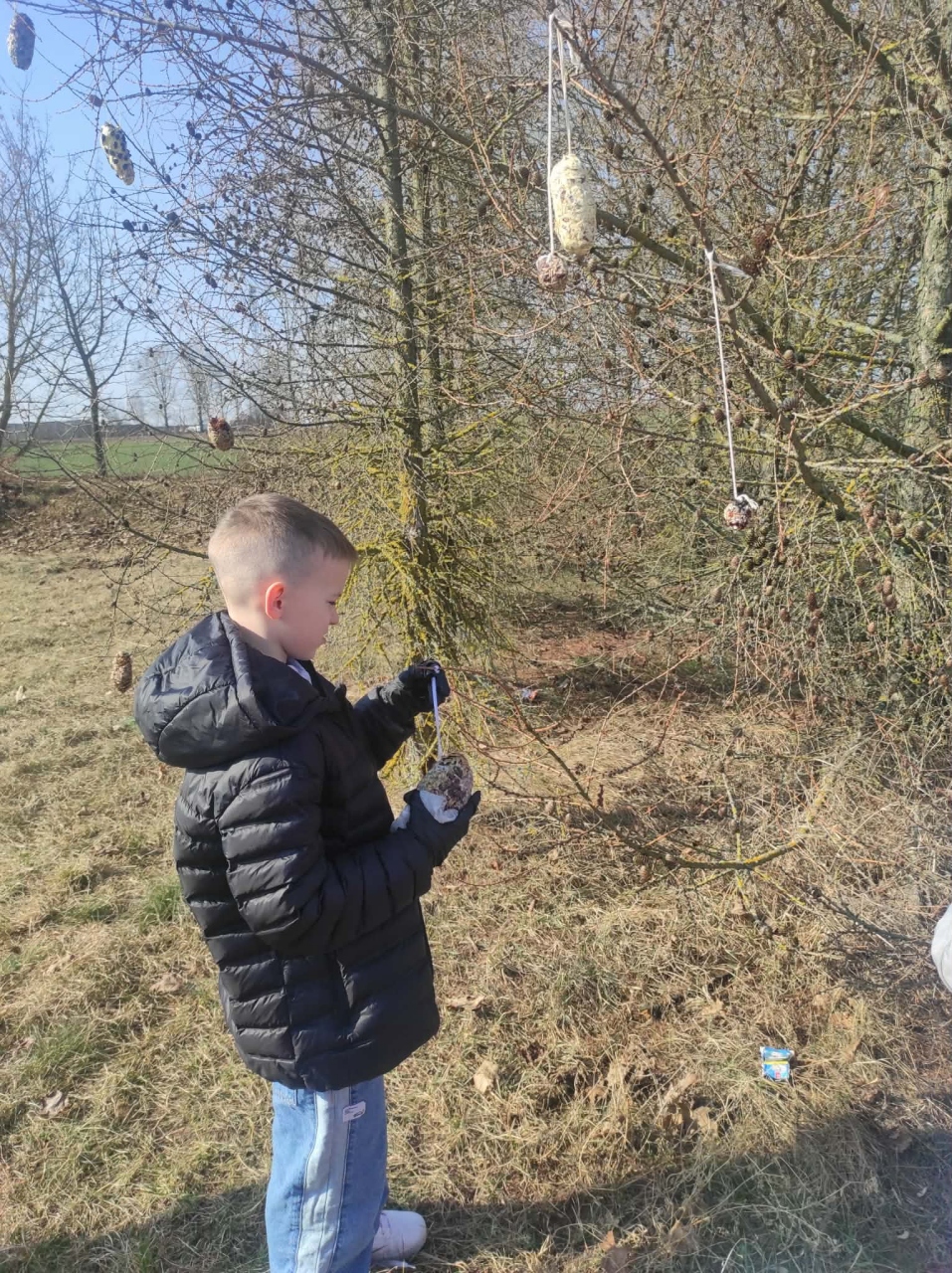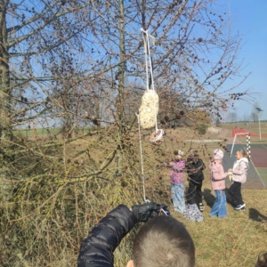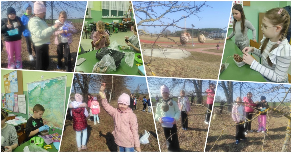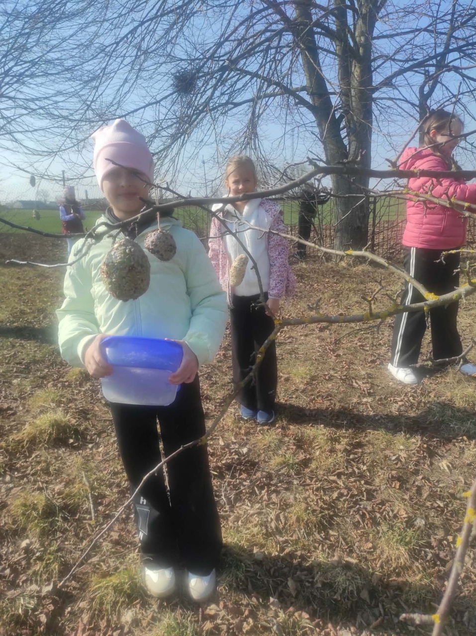 Uczniowie klasy II a wzięli udział w projekcie biblioteki szkolnej pod hasłem: „ Biblioteki pełne dobrej energii”. Do działania na rzecz ptaków zainspirowała ich książka pt. „Chodź na dwór! Praktyczne ćwiczenia z przyrody”. Uczniowie zapoznali się ze sposobami dokarmiania ptaków. Poznali różne składniki pokarmowe, które zostały wykorzystane do wykonania szyszkowych karmników. Na podstawie praktycznych ćwiczeń, które były przedstawione w książce pt. “Chodź na dwór” wykonali szyszki pełne specjałów i smakowitych kąsków dla ptaków. Po czym wybrali się na wycieczkę wokół szkoły celem znalezienia drzew i krzewów. Swoje karmniki pozawieszali na gałęziach. Bacznie obserwując ptaki, które latały wokół. Realizacja tego zadania miała na celu wzmacnianie więzi z naturą, rozwijanie empatii i nawyku pomagania, dzielenia się. Edukacja techniczna połączoną z edukacją przyrodniczą znacznie wpłynęła na kreatywność i rozwój manualnych umiejętności. Dzięki tej wycieczce uczniowie zrozumieli potrzeby ptaków.