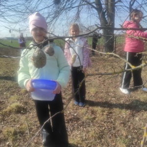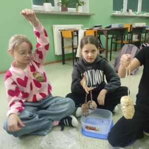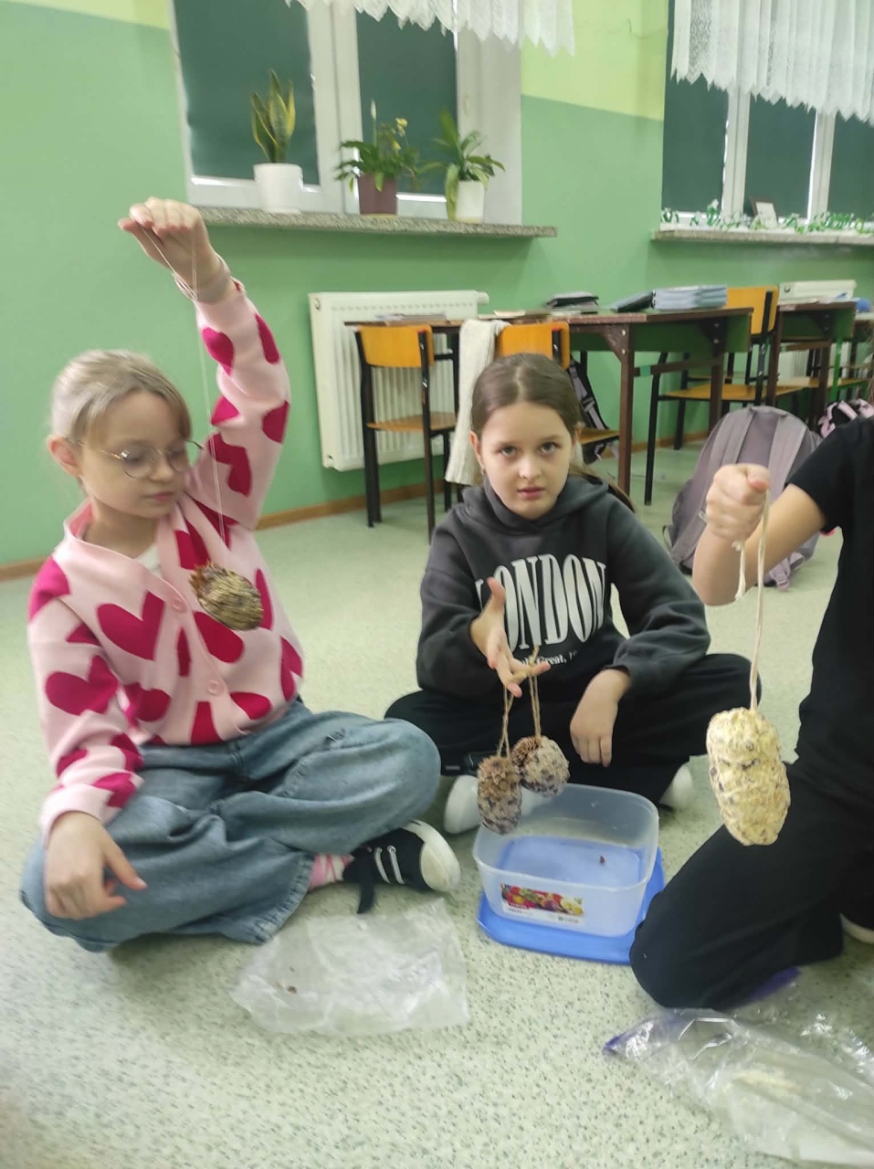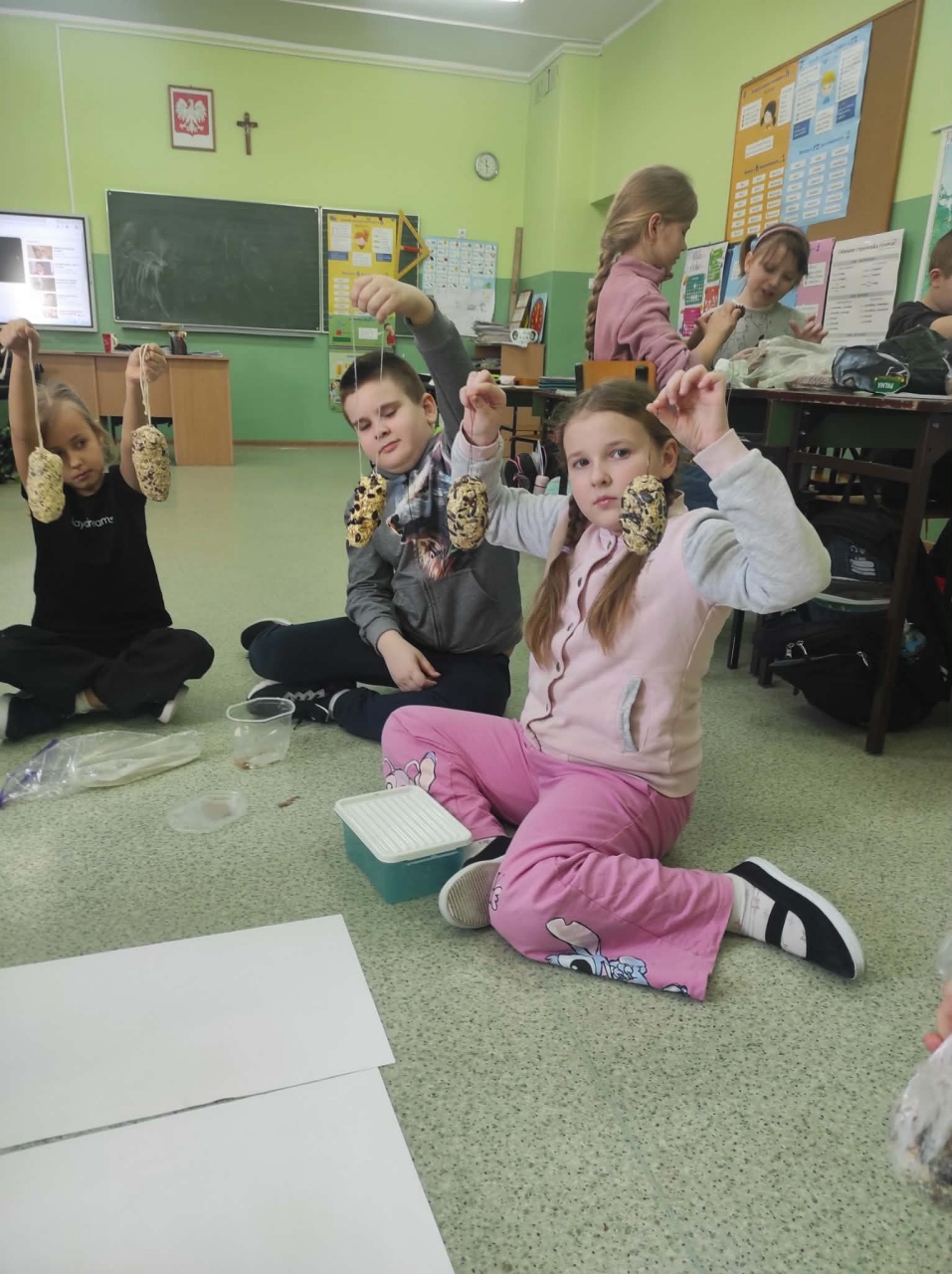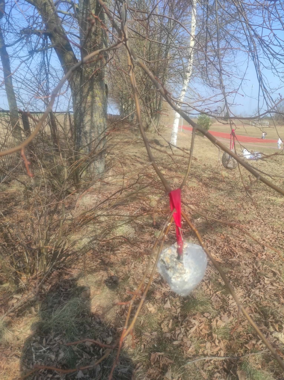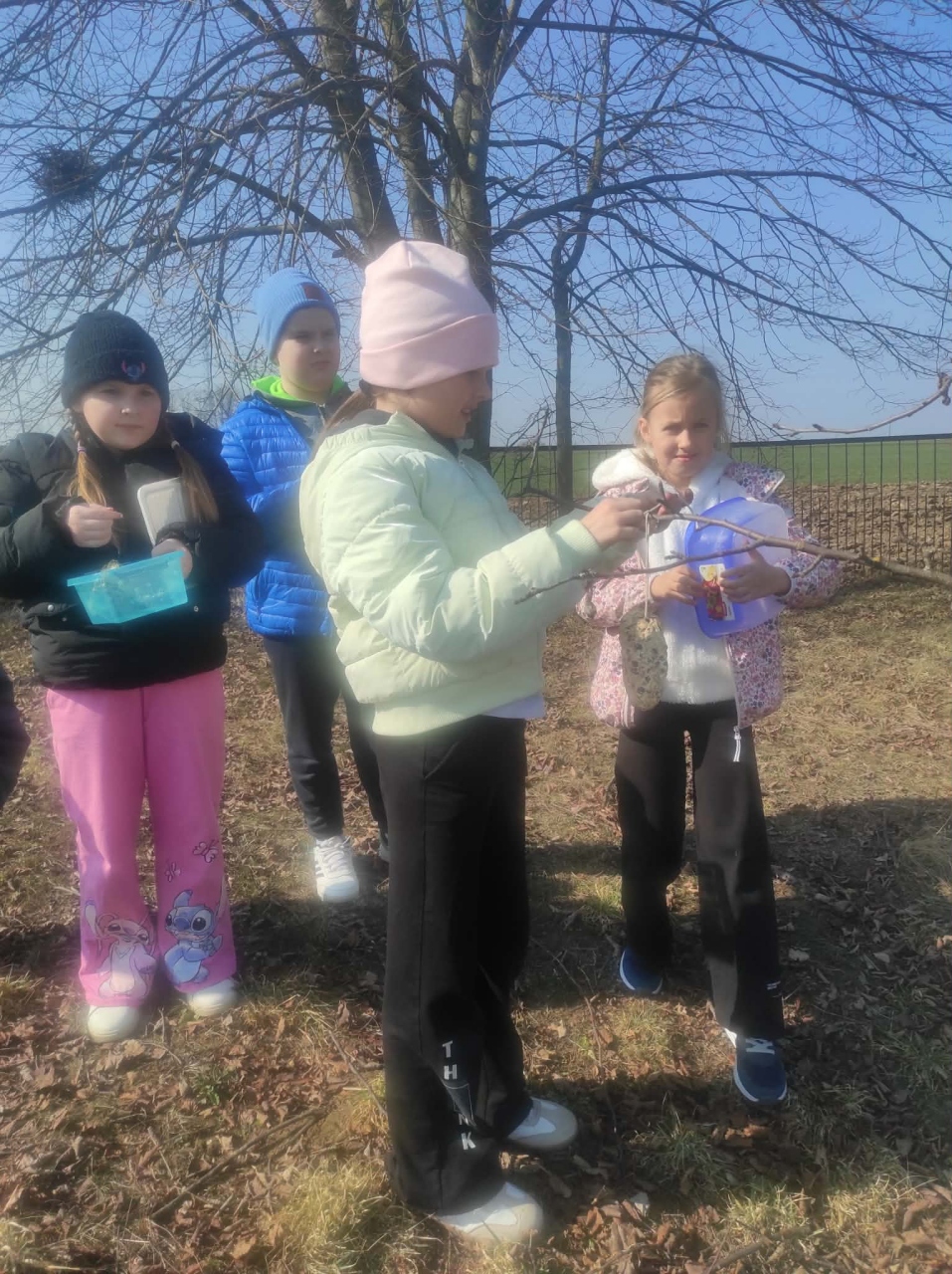 Uczniowie klasy II a wzięli udział w projekcie biblioteki szkolnej pod hasłem: „ Biblioteki pełne dobrej energii”. Do działania na rzecz ptaków zainspirowała ich książka pt. „Chodź na dwór! Praktyczne ćwiczenia z przyrody”. Uczniowie zapoznali się ze sposobami dokarmiania ptaków. Poznali różne składniki pokarmowe, które zostały wykorzystane do wykonania szyszkowych karmników. Na podstawie praktycznych ćwiczeń, które były przedstawione w książce pt. “Chodź na dwór” wykonali szyszki pełne specjałów i smakowitych kąsków dla ptaków. Po czym wybrali się na wycieczkę wokół szkoły celem znalezienia drzew i krzewów. Swoje karmniki pozawieszali na gałęziach. Bacznie obserwując ptaki, które latały wokół. Realizacja tego zadania miała na celu wzmacnianie więzi z naturą, rozwijanie empatii i nawyku pomagania, dzielenia się. Edukacja techniczna połączoną z edukacją przyrodniczą znacznie wpłynęła na kreatywność i rozwój manualnych umiejętności. Dzięki tej wycieczce uczniowie zrozumieli potrzeby ptaków.