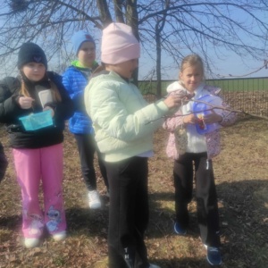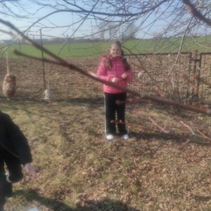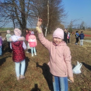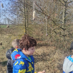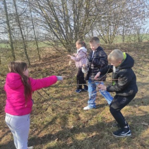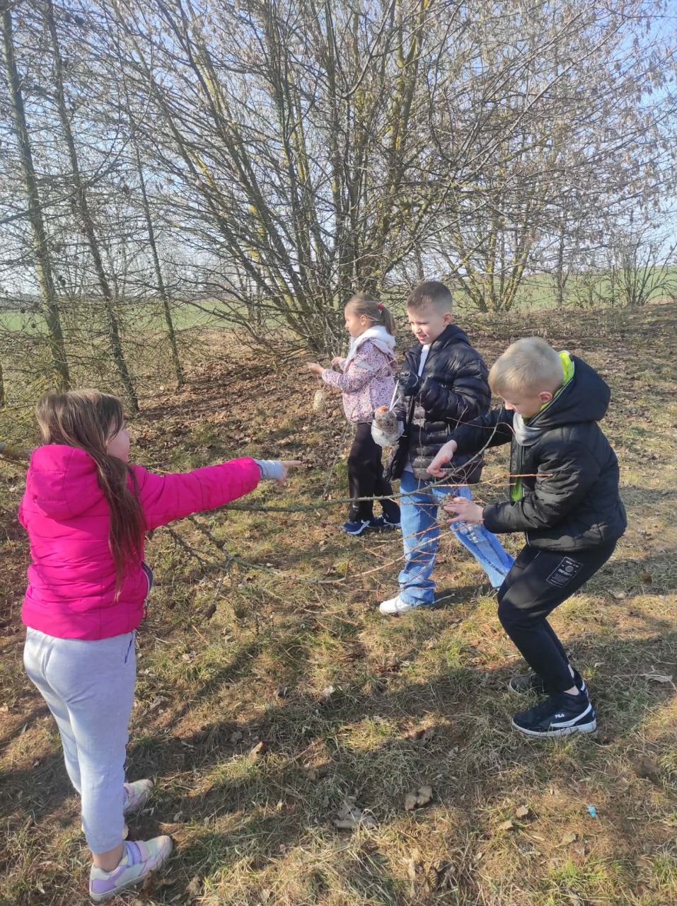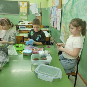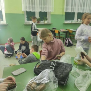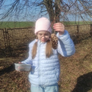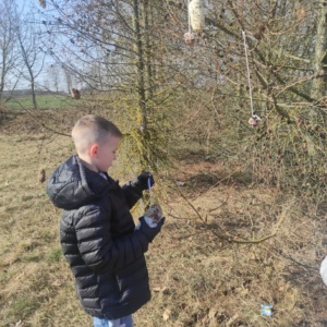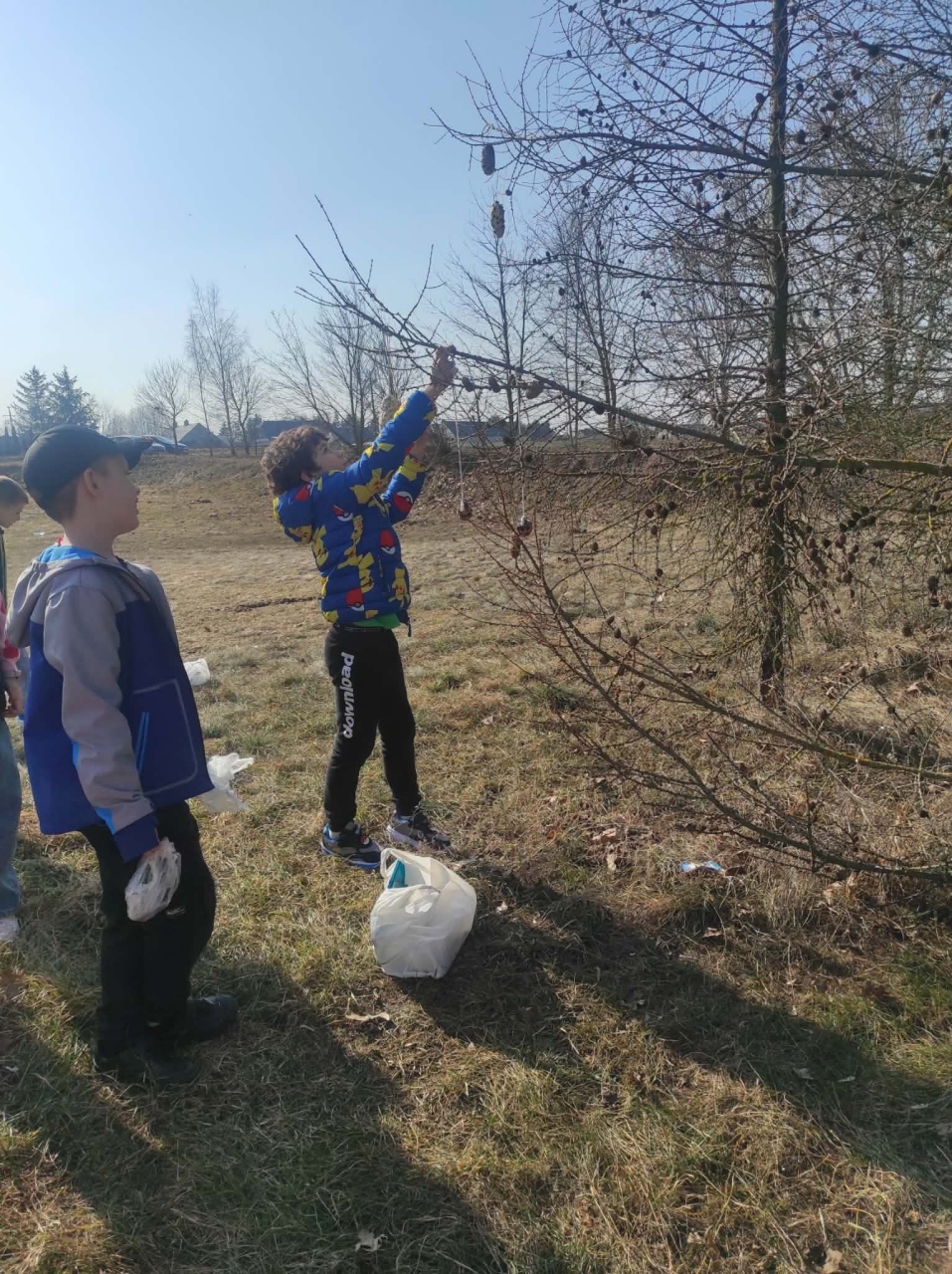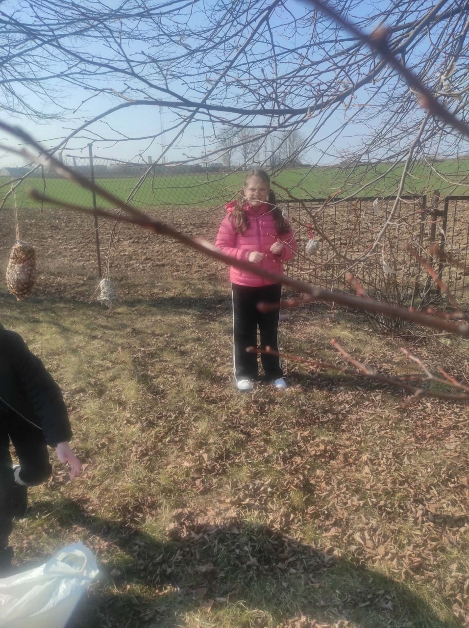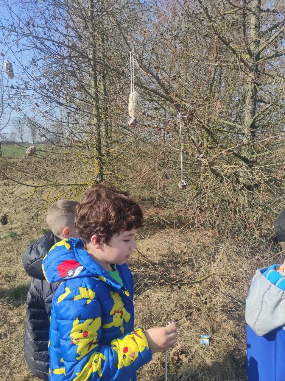 Uczniowie klasy II a wzięli udział w projekcie biblioteki szkolnej pod hasłem: „ Biblioteki pełne dobrej energii”. Do działania na rzecz ptaków zainspirowała ich książka pt. „Chodź na dwór! Praktyczne ćwiczenia z przyrody”. Uczniowie zapoznali się ze sposobami dokarmiania ptaków. Poznali różne składniki pokarmowe, które zostały wykorzystane do wykonania szyszkowych karmników. Na podstawie praktycznych ćwiczeń, które były przedstawione w książce pt. “Chodź na dwór” wykonali szyszki pełne specjałów i smakowitych kąsków dla ptaków. Po czym wybrali się na wycieczkę wokół szkoły celem znalezienia drzew i krzewów. Swoje karmniki pozawieszali na gałęziach. Bacznie obserwując ptaki, które latały wokół. Realizacja tego zadania miała na celu wzmacnianie więzi z naturą, rozwijanie empatii i nawyku pomagania, dzielenia się. Edukacja techniczna połączoną z edukacją przyrodniczą znacznie wpłynęła na kreatywność i rozwój manualnych umiejętności. Dzięki tej wycieczce uczniowie zrozumieli potrzeby ptaków.