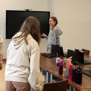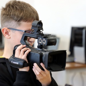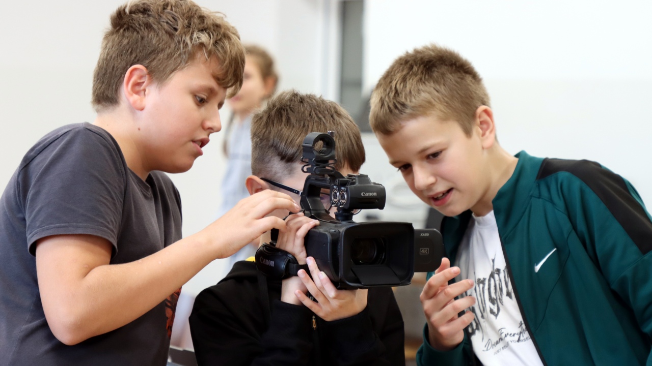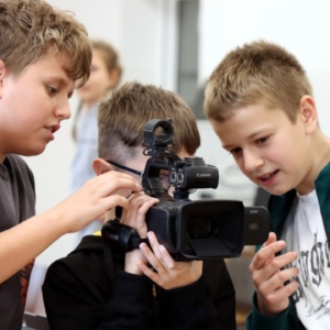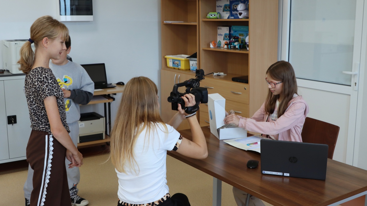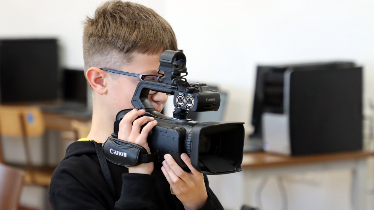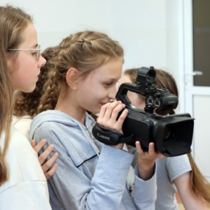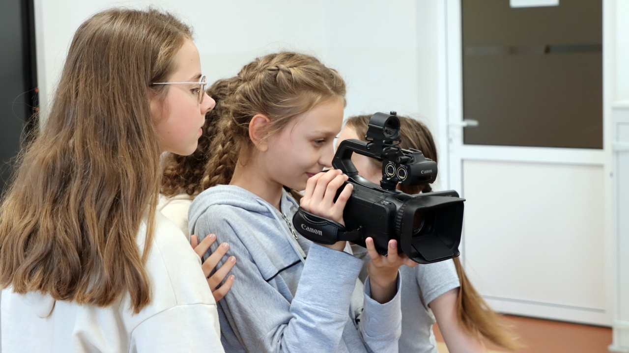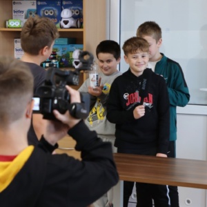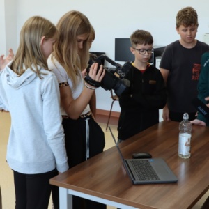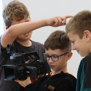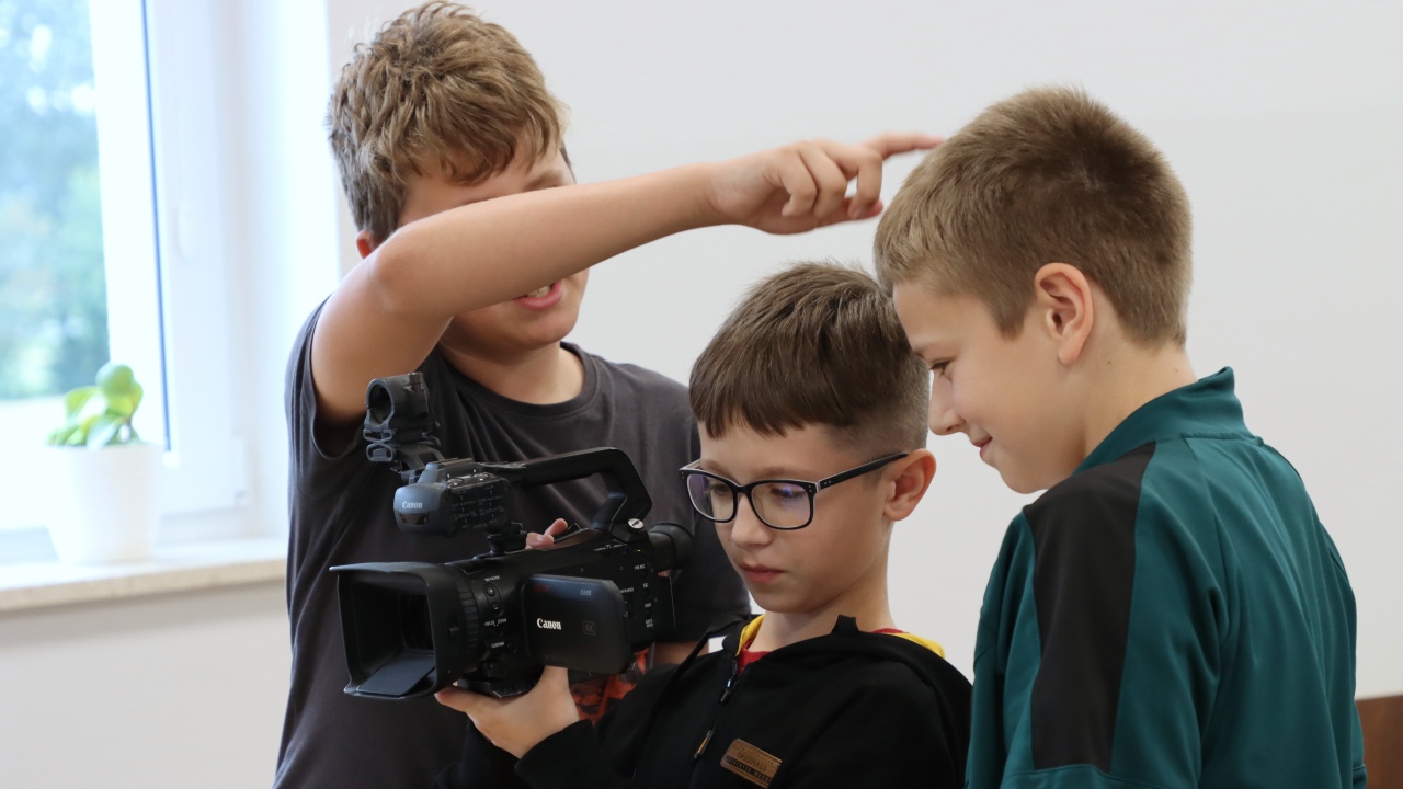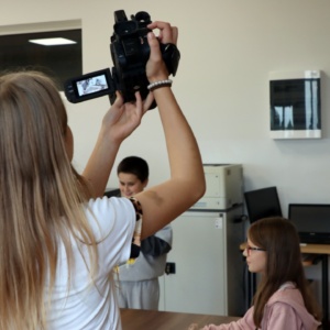 Zajęcia rozpoczęły się od wspólnego opracowania scenariuszy. Pomysłów nie brakowało – uczniowie z zaangażowaniem dyskutowali, planowali ujęcia i dzielili się zadaniami w zespole. Następnie przyszedł czas na nagrania z wykorzystaniem profesjonalnego sprzętu, co pozwoliło im poczuć się jak prawdziwi filmowcy.