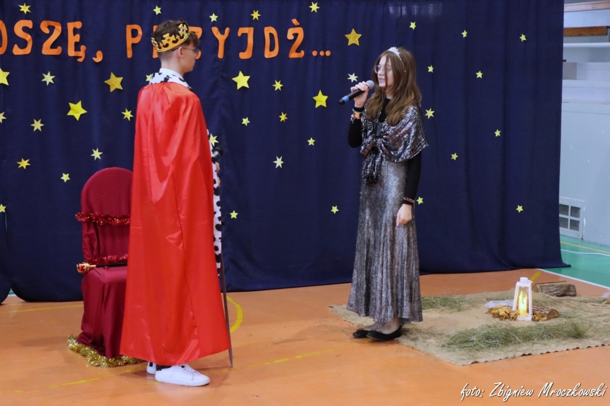 Świąteczny występ rozpoczęła Asia Mroczkowska utworem „Panie, proszę, przyjdź…”. To piękna wzruszająca pieśń opowiadająca o potrzebie bliskości człowieka z Bogiem. Na scenie zaczęły pojawiać się kolejne postacie, które doświadczyły bezpośredniego spotkania z Jezusem- pasterze, królowie, a nawet dzieci, bo przecież one mają serca czyste, otwarte i gotowe na przyjęcie Pana. Niestety, świat nie jest wolny od zła i to zło również przypomniało o sobie w czasie narodzenia Chrystusa. Król Herod poczuł się zagrożony i rozkazał swoim żołnierzom wymordować wszystkie dzieci. Na nic zdały się błagania żony- żądza władzy była silniejsza. Dzieciątko jednakże zostało uratowane.