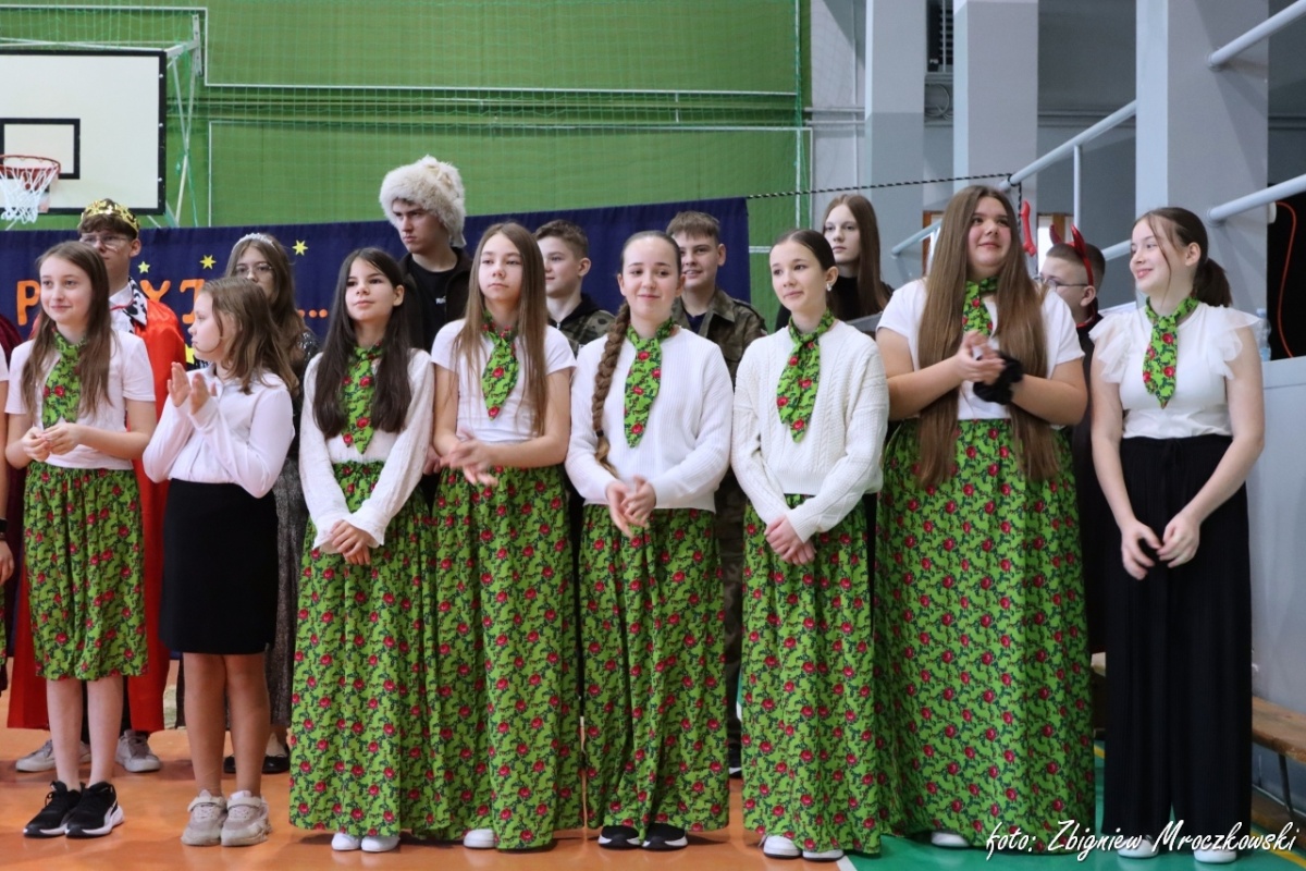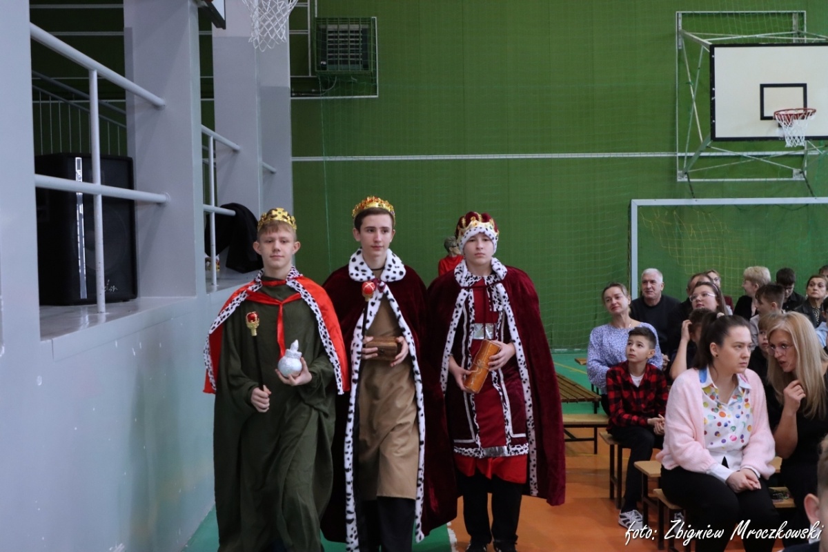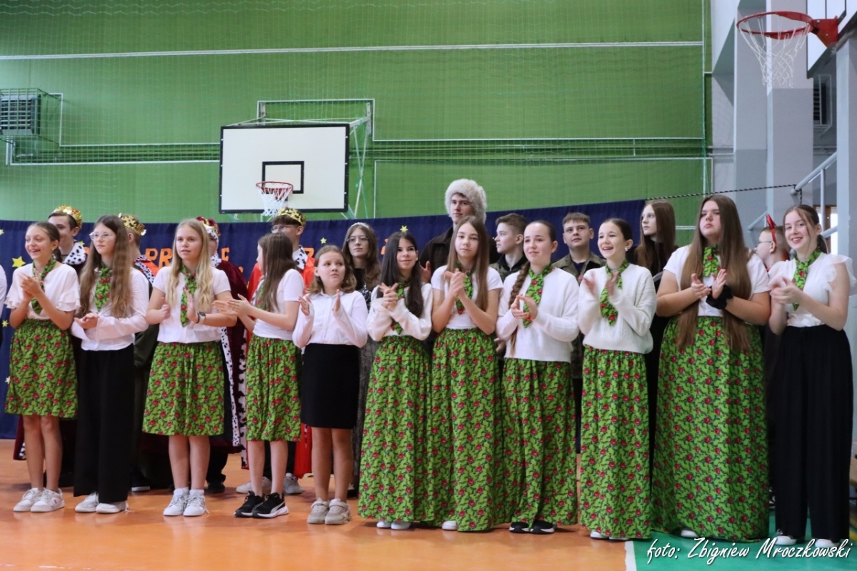 Wydarzenia odgrywane na scenie były przeplatane kolędami i pastorałkami w wykonaniu „Jarzębinek”. Uroczystość zakończyło zespołowe odśpiewanie pieśni „Jezus siłą mą”, która stała się wezwaniem do szczerego przyjęcia Pana, pełnego zaufania Mu i czerpania z Niego siły do życia, nauki i pracy.