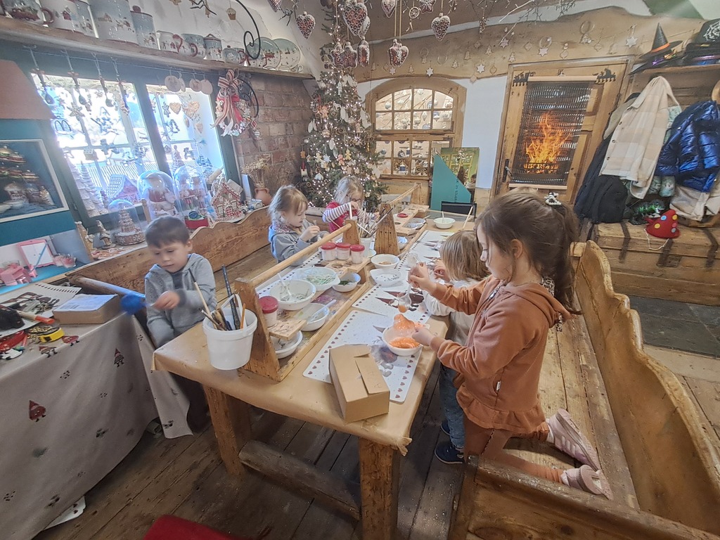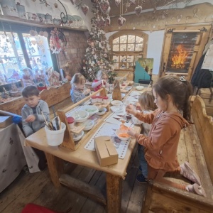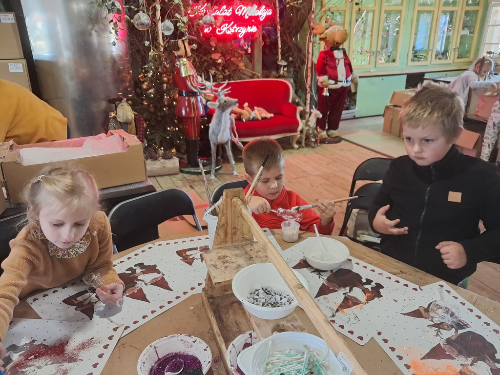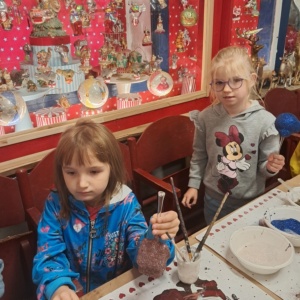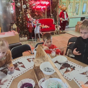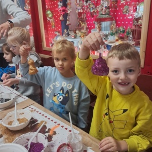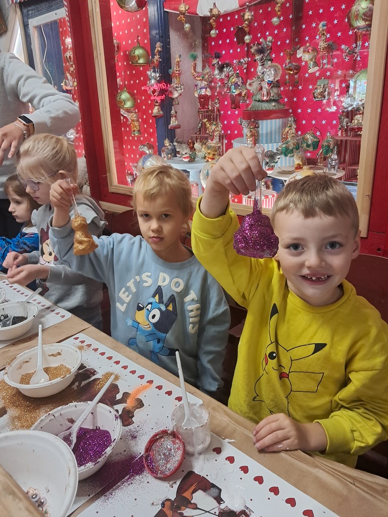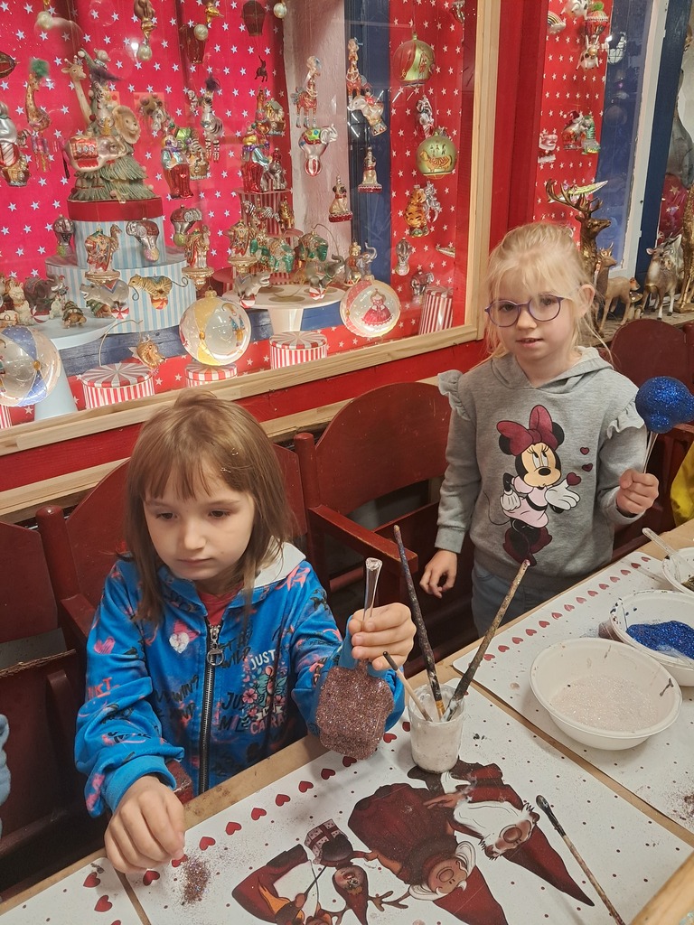 Potem przyszła kolej na praktykę. Elf zademonstrował nam, jak się „dmucha” bombki ze szkła, po czym każdy mógł „wydmuchać” sobie taką bombkę. Następny etap to ozdabianie, czyli klej i mnóstwo brokatu, świecidełek, farbek i innych ozdób.